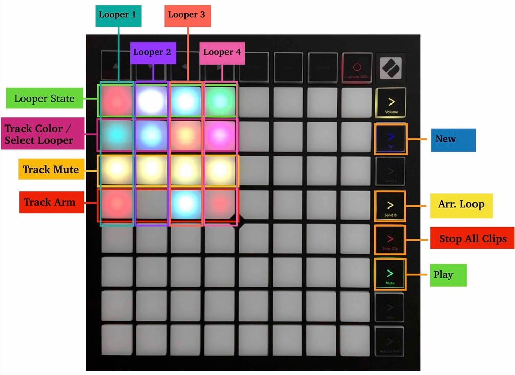 LOOPER:MODE is a Control Surface script for Push and Launchpad, that allows you to monitor and control up to 16 Looper devices on a single page.